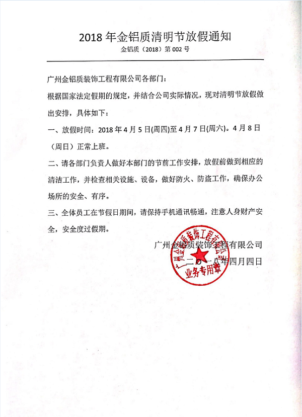 2018年金鋁質清明節(jié)放假通知