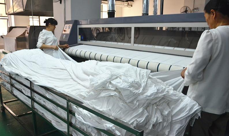 工作人員將洗凈的床單擺放整齊過機(jī),統(tǒng)一通過機(jī)器烘熨。
